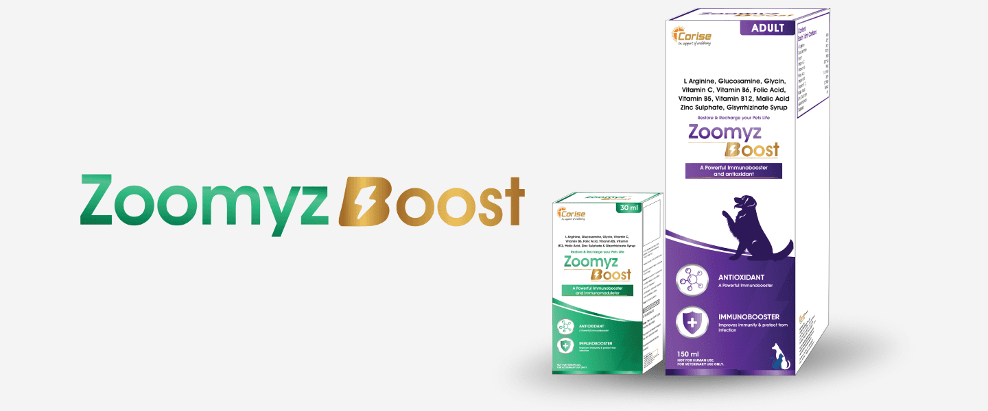 Zoomyz Boost is a powerful veterinary immunobooster and antioxidant syrup formulated to support joint mobility, muscle recovery, skin and coat health, and overall vitality in pets. Enriched with L-Arginine, Glucosamine, essential vitamins, and minerals, it aids in liver detoxification and helps pets recover pre and post illness, including parvoviral infections. Suitable for puppies, adult, and geriatric pets, Zoomyz Boost promotes energy, immune strength, and optimal pet health.